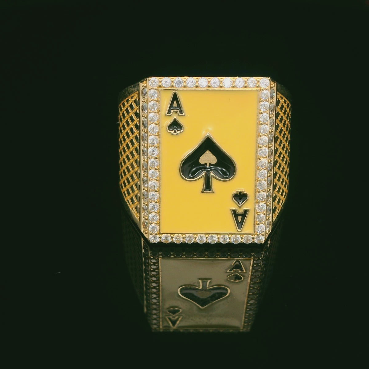 Crafted in 14K gold, this bold ring features a square 20mm face with an Ace of Spades playing-card design in a sleek enamel finish, framed by a sparkling CZ (cubic zirconia) border. The textured lattice-style sides add depth and a premium look, making it a standout everyday statement piece.