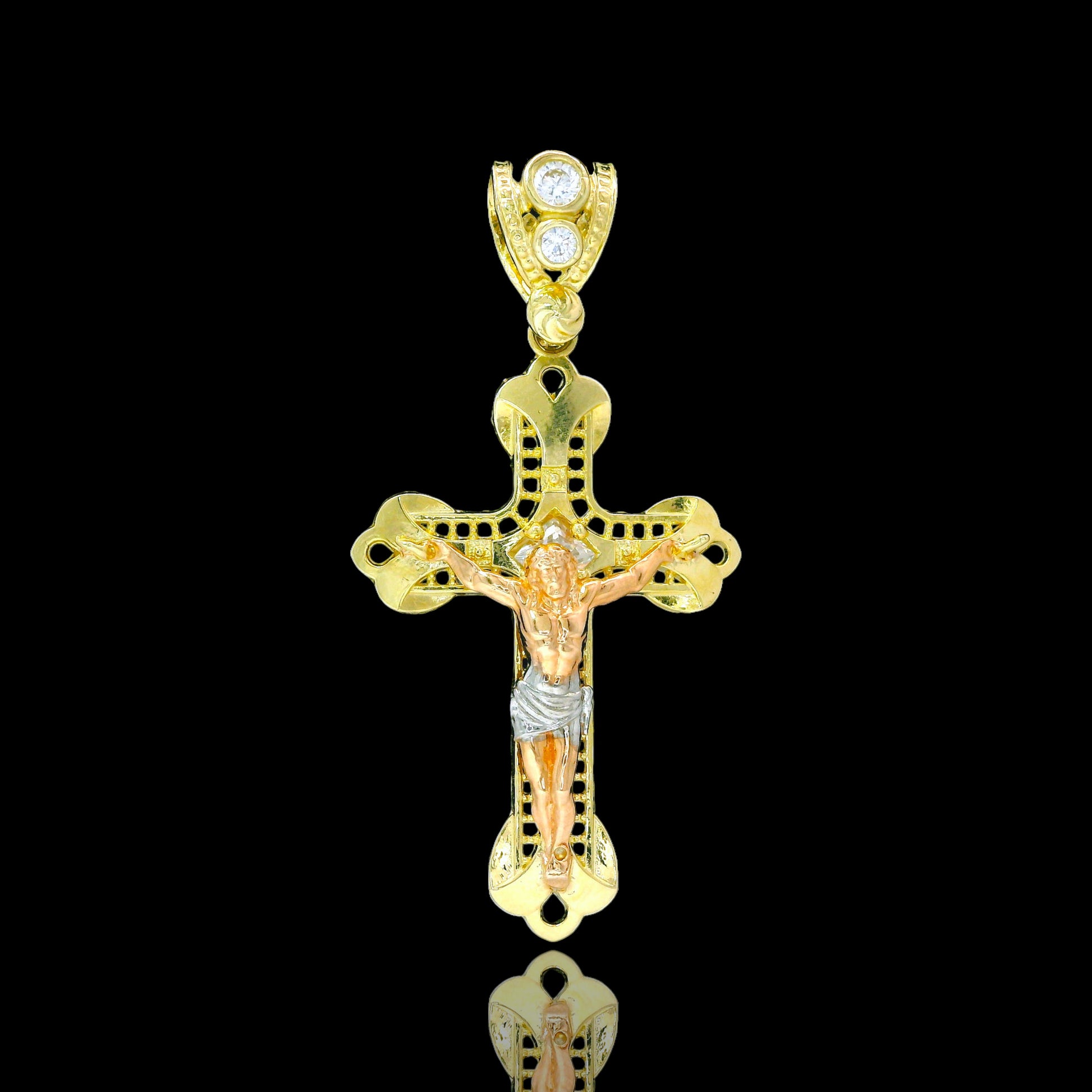 14K Gold & CZ Bail Baroque Crucifix Pendant with Tri-Tone Christ