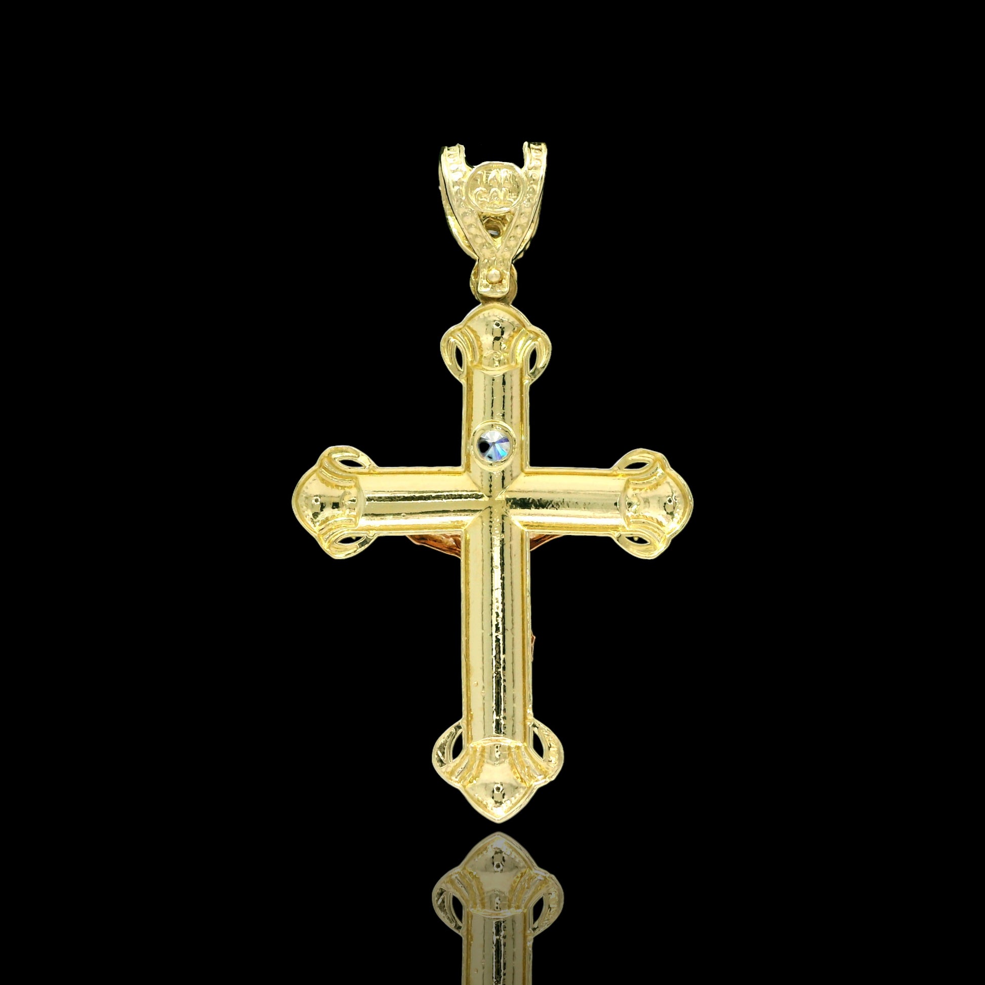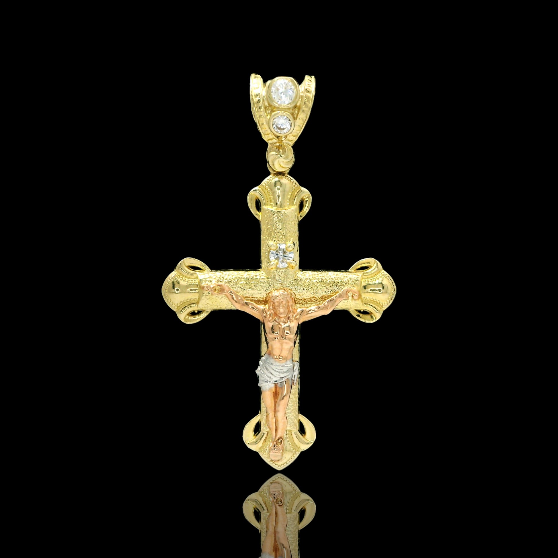 This 14K gold crucifix pendant features a beautifully textured cross and a detailed bicolor Christ figure for a striking expression of faith. Sparkling cubic zirconia (CZ) stones highlight the top and center of the cross, adding extra brilliance to the design. Measuring approximately 36 mm in length, it’s perfect for everyday wear or as a meaningful gift