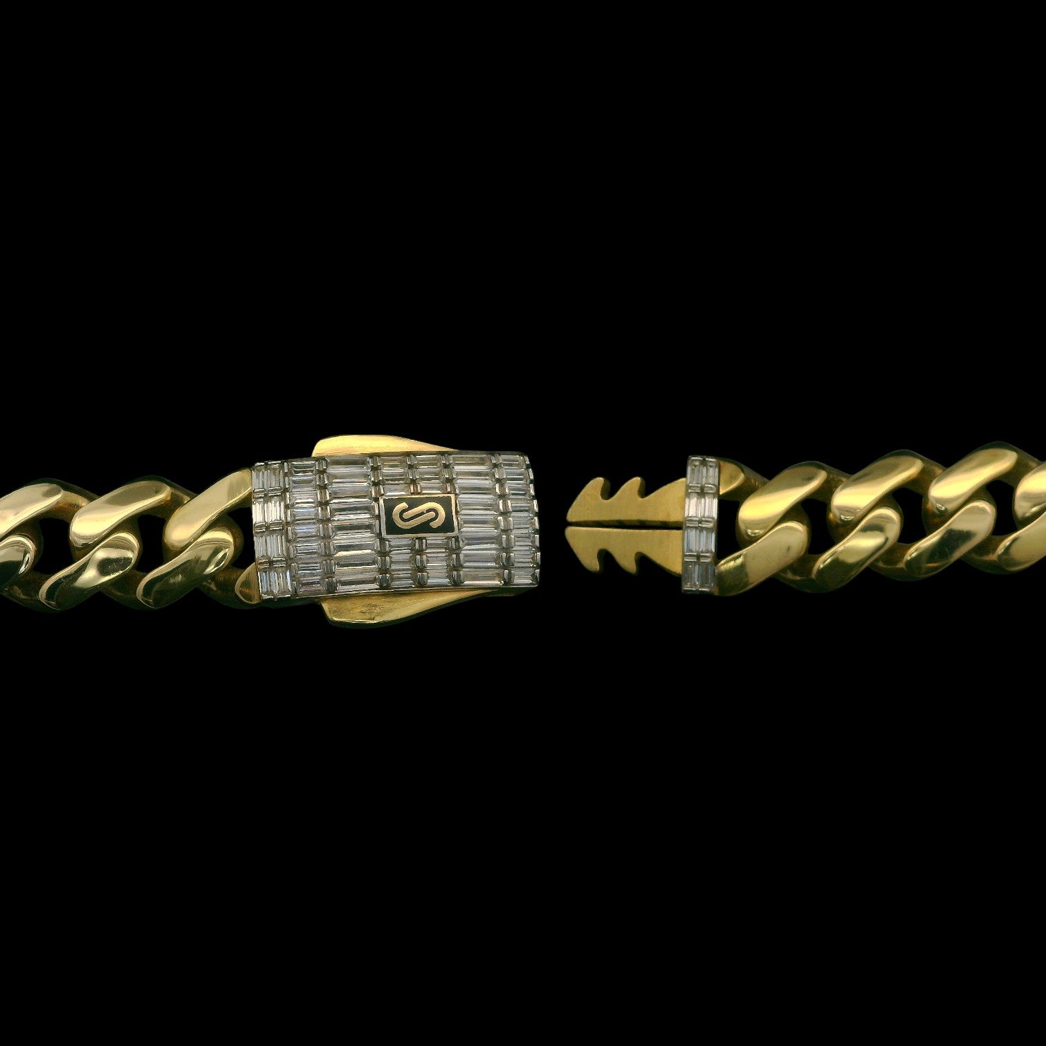 This Monaco original bracelet is crafted in 14K yellow gold with bold, high-polish Cuban links. The standout detail is the signature box lock, fully set with baguette-style CZs and finished with the Monaco emblem for that designer look. It’s a strong, eye-catching piece that feels luxurious on the wrist—perfect for everyday wear or to level up a special outfit.