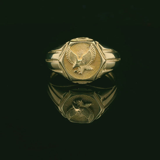 Bold 14K gold signet ring featuring a 13mm face with a detailed eagle relief over a sunburst-style background for extra depth and shine. Finished with a clean, high-polish look and crisp engraving, this classic statement piece is made to stand out—perfect for everyday wear or as a timeless gift.