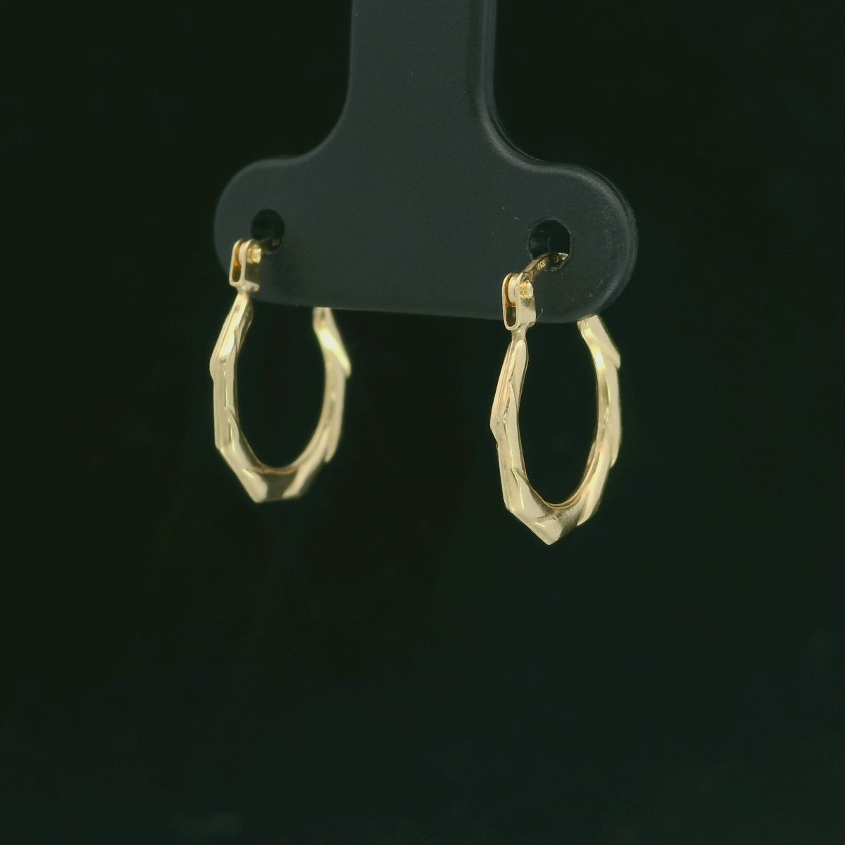 These 14mm hoop earrings are made in 14K yellow gold with a sleek, twisted octagon design that gives them a modern look and a smooth, polished shine (not diamond-cut). They’re lightweight and comfortable, with a hinged latch-back closure that’s easy to wear and stays secure—perfect for everyday use or stacking with other hoops.