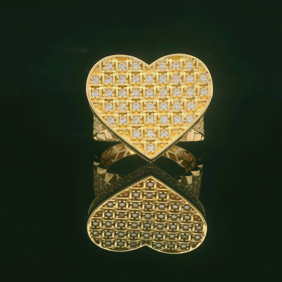 This 14K solid gold ring features a bold 21 mm heart front, covered in a neat squared pattern of sparkling CZ stones that catch the light from every angle. The shoulders of the band are also pavé-set with CZ for extra shine, while the back tapers for a comfortable, easy everyday fit. A bright, eye-catching heart design in real gold that looks amazing on its own or stacked with your favorite rings.
