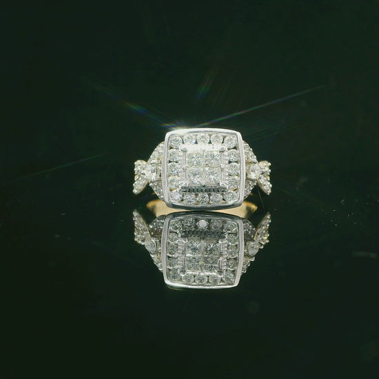 This dazzling women’s ring features 2.75 total carats of natural diamonds set in a bold cushion-style cluster. The center is formed by tightly set square and round diamonds, framed by a sparkling diamond halo and diamond-accented shoulders for extra brilliance from every angle. Expertly crafted in solid 10K gold, this statement ring delivers high-impact shine and luxurious style, perfect for special occasions or everyday glamour.