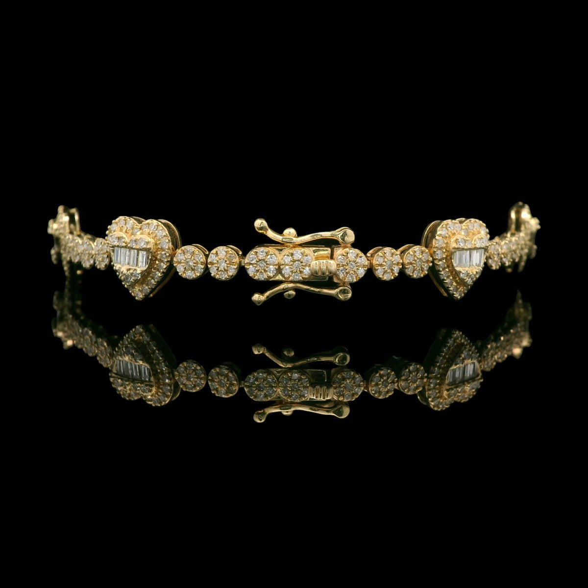 This 14K yellow gold bracelet is all about soft sparkle and romance. Along the 7" length, round diamond clusters (about 4 mm each) lead up to three heart-shaped stations measuring around 9 mm. Each heart is outlined in round diamonds and filled with baguette-style diamonds in the center for extra shine. With 2.23 total carats of diamonds, it’s a bright, feminine piece that looks beautiful on its own or stacked with your other favorites. Perfect for gifting or treating yourself to something special.