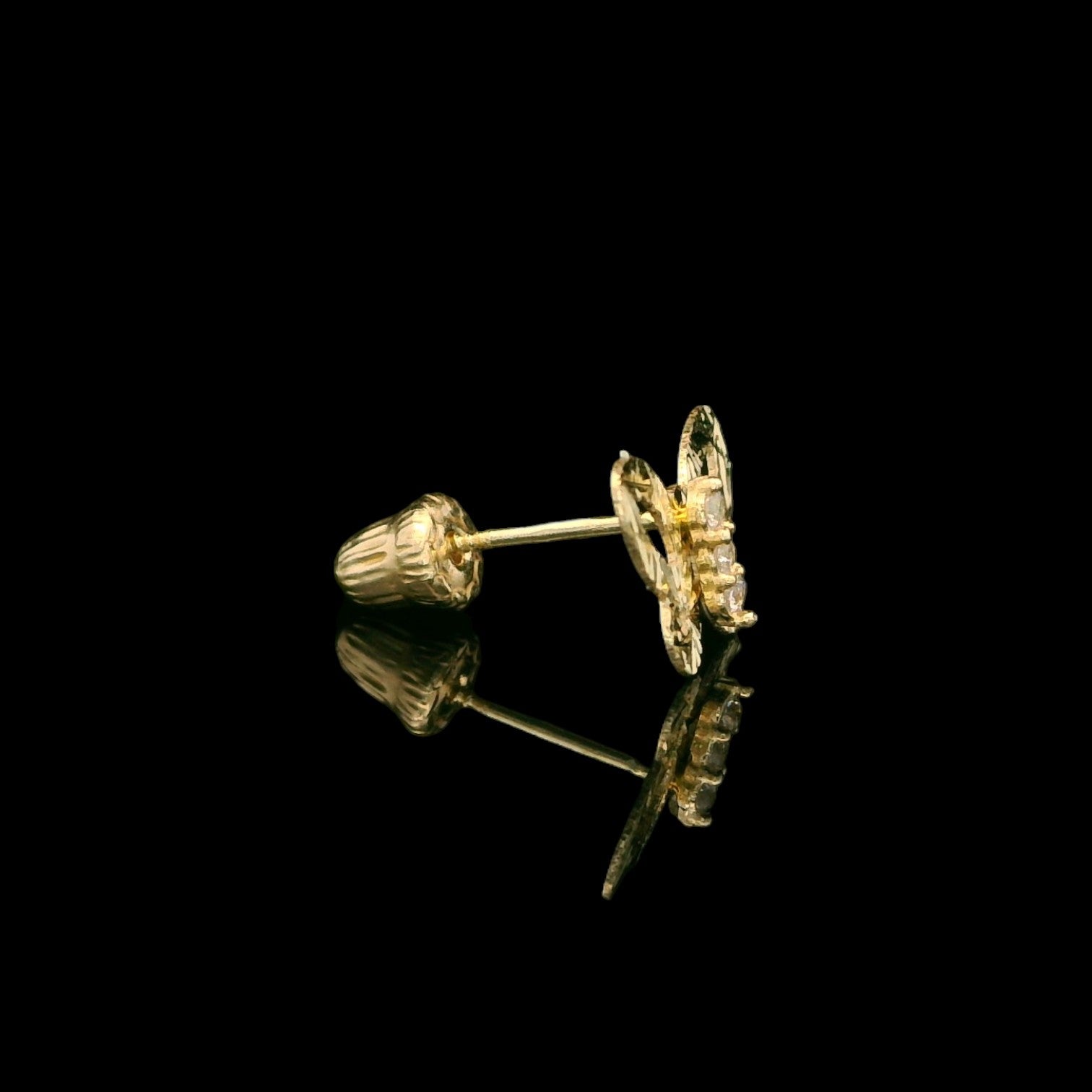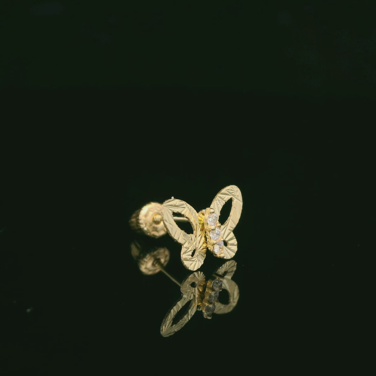 These adorable butterfly stud earrings are crafted in genuine 14K yellow gold and finished with diamond-cut detailing for extra sparkle. Each 5mm butterfly features a sleek open-wing design with three clear CZ stones down the center for a bright, eye-catching shine. Made with a secure screw-back closure (perfect for a snug, comfortable fit), they’re an easy everyday pair—cute, polished, and lightweight.