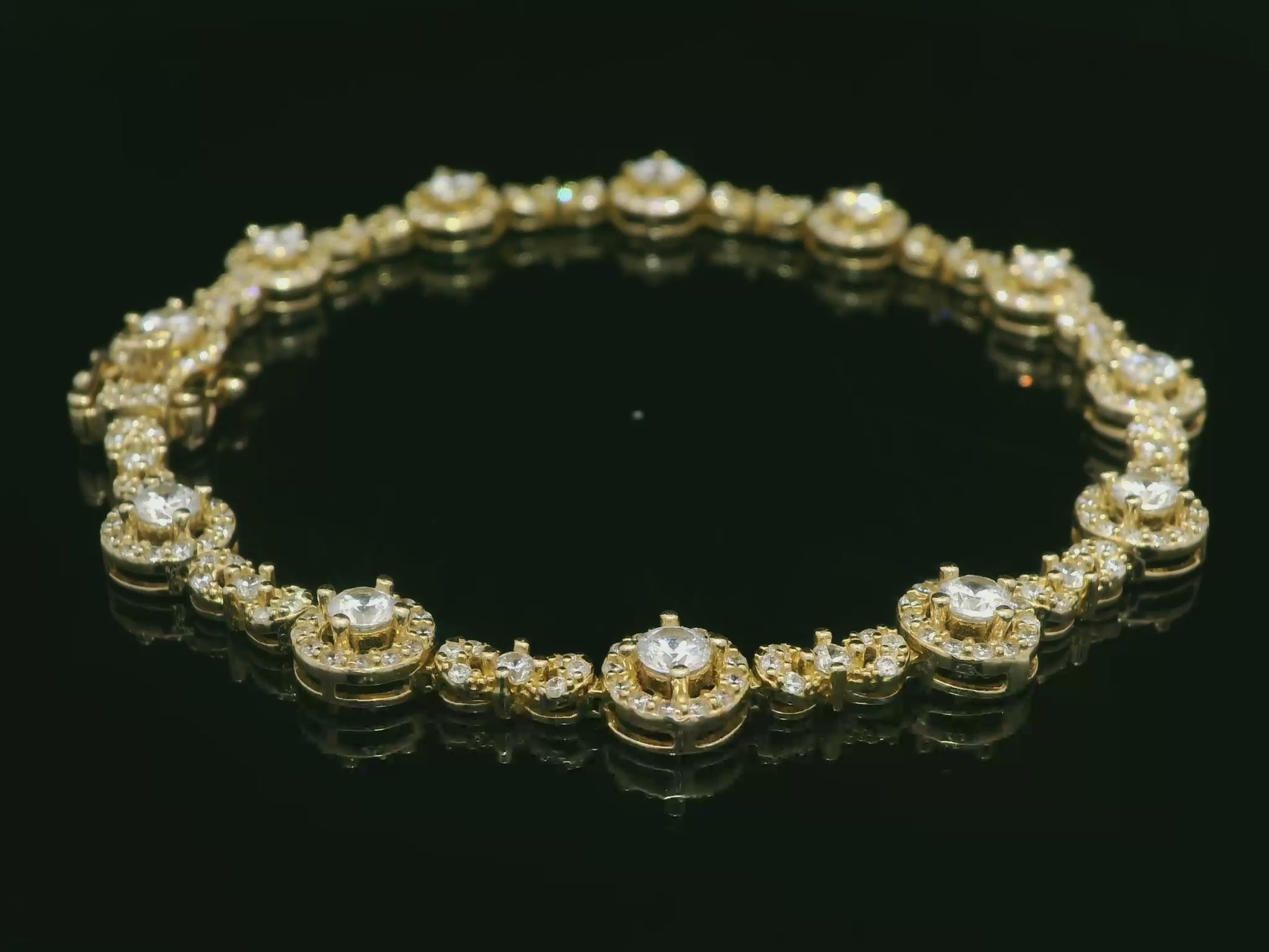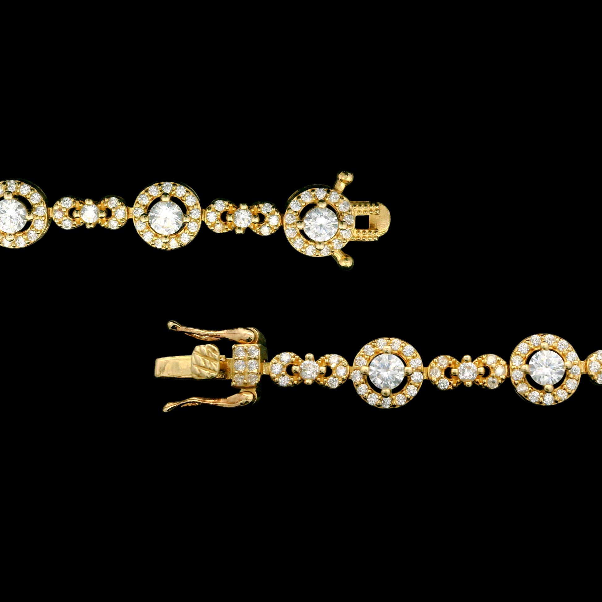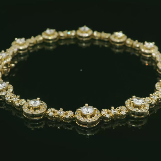 This 14K yellow gold tennis-style bracelet features a row of round links, each set with a bright clear CZ in the center and a full halo of smaller stones around it for extra sparkle. The bracelet measures about 7mm in width and 7.5" in length, giving it a bold, luxurious look while still feeling comfortable on the wrist. Finished with a secure box clasp and safety for peace of mind, it’s the perfect piece to dress up any outfit—whether you wear it solo or stacked with your favorite bangles.