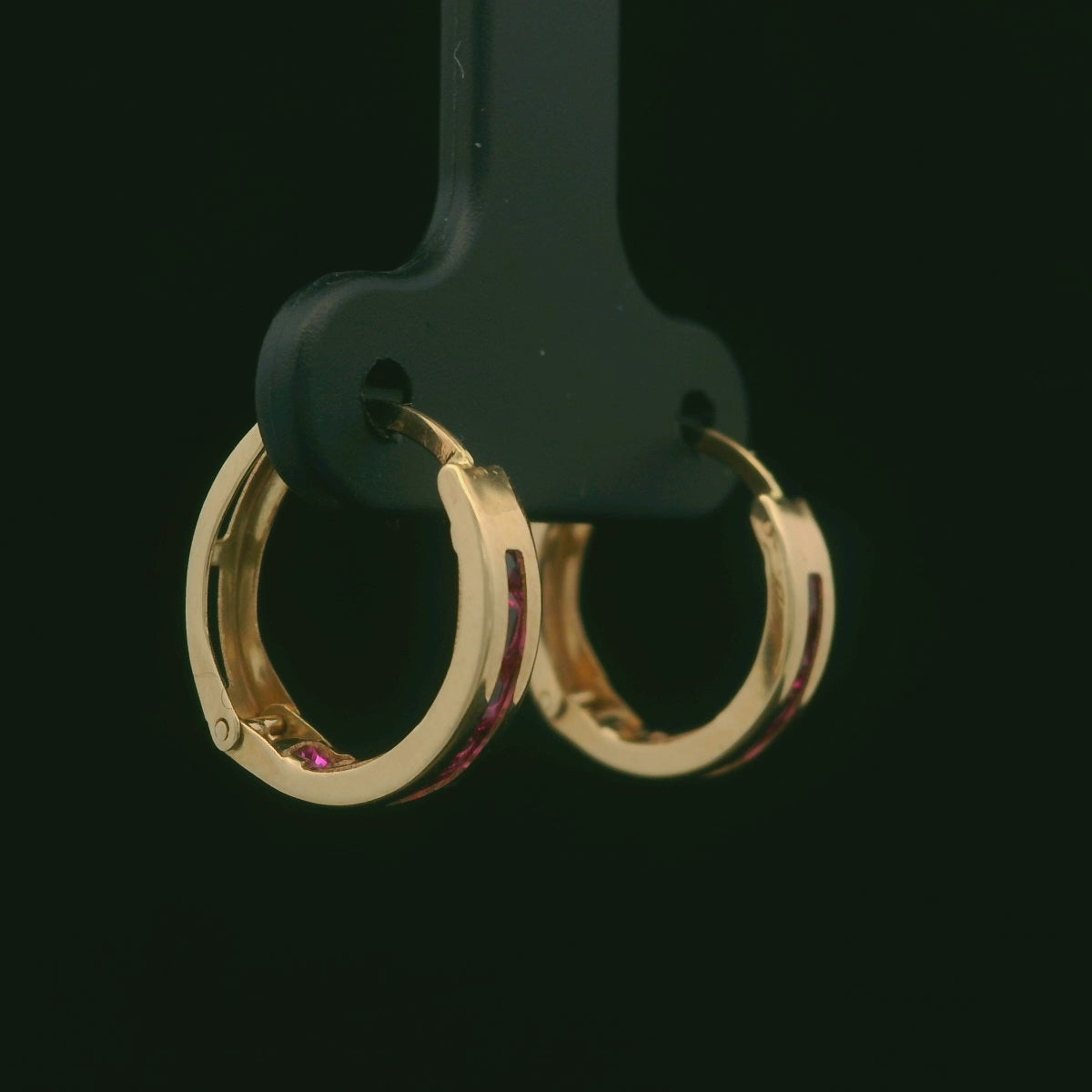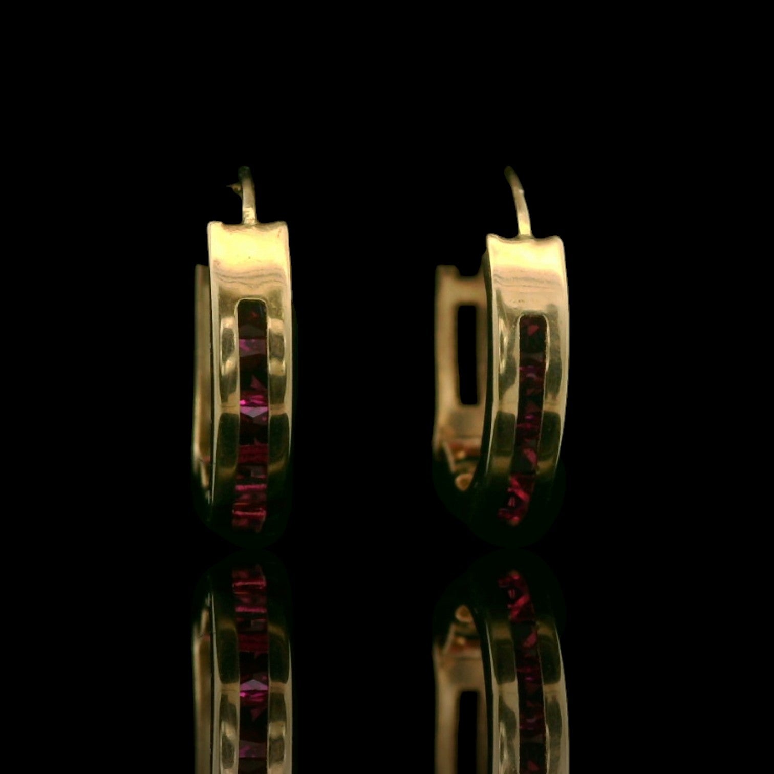 These 14K yellow gold huggie hoops measure about 14mm long and 3mm wide, with a sleek front strip of deep red channel-set stones for a bold pop of color. The rounded design hugs the ear comfortably, making them an easy everyday pair that still stands out—perfect solo or stacked with other favorites.