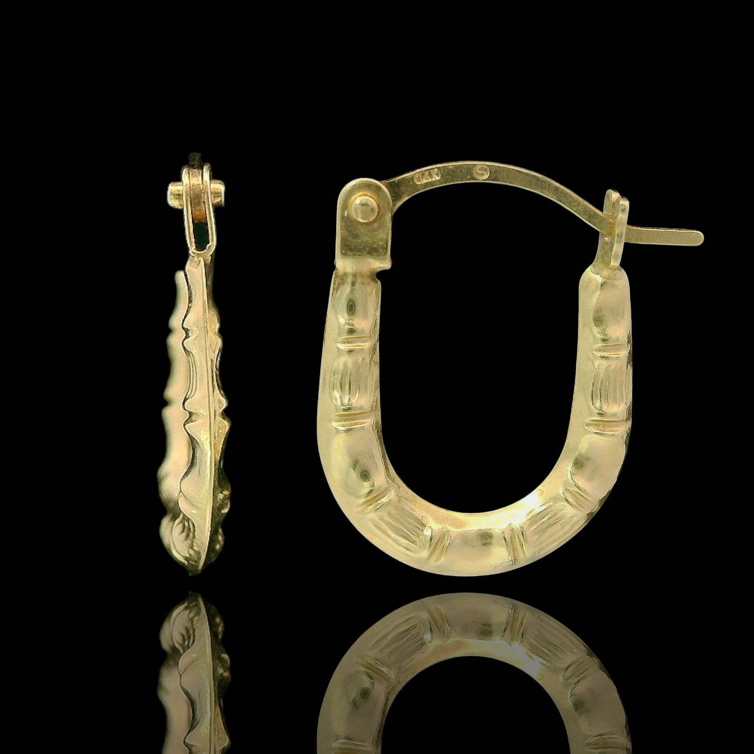 These petite 14K yellow gold U-shaped hoop earrings feature a soft wavy texture with subtle grooves that catch the light from every angle. Measuring about 13mm in height, they’re lightweight, comfortable, and perfect for everyday wear. A classic hinged closure keeps them secure while adding just the right touch of shine to any look.