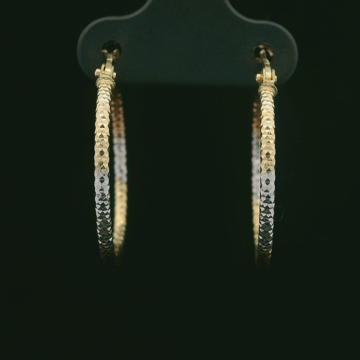 These 14K gold hoops bring all the shine with a diamond-cut finish in three tones—yellow, white, and rose. The textured surface catches the light from every angle, giving them a sparkly, shimmering look without any stones. Lightweight and easy to wear, they’re the perfect everyday hoops with a trendy tri-color twist.