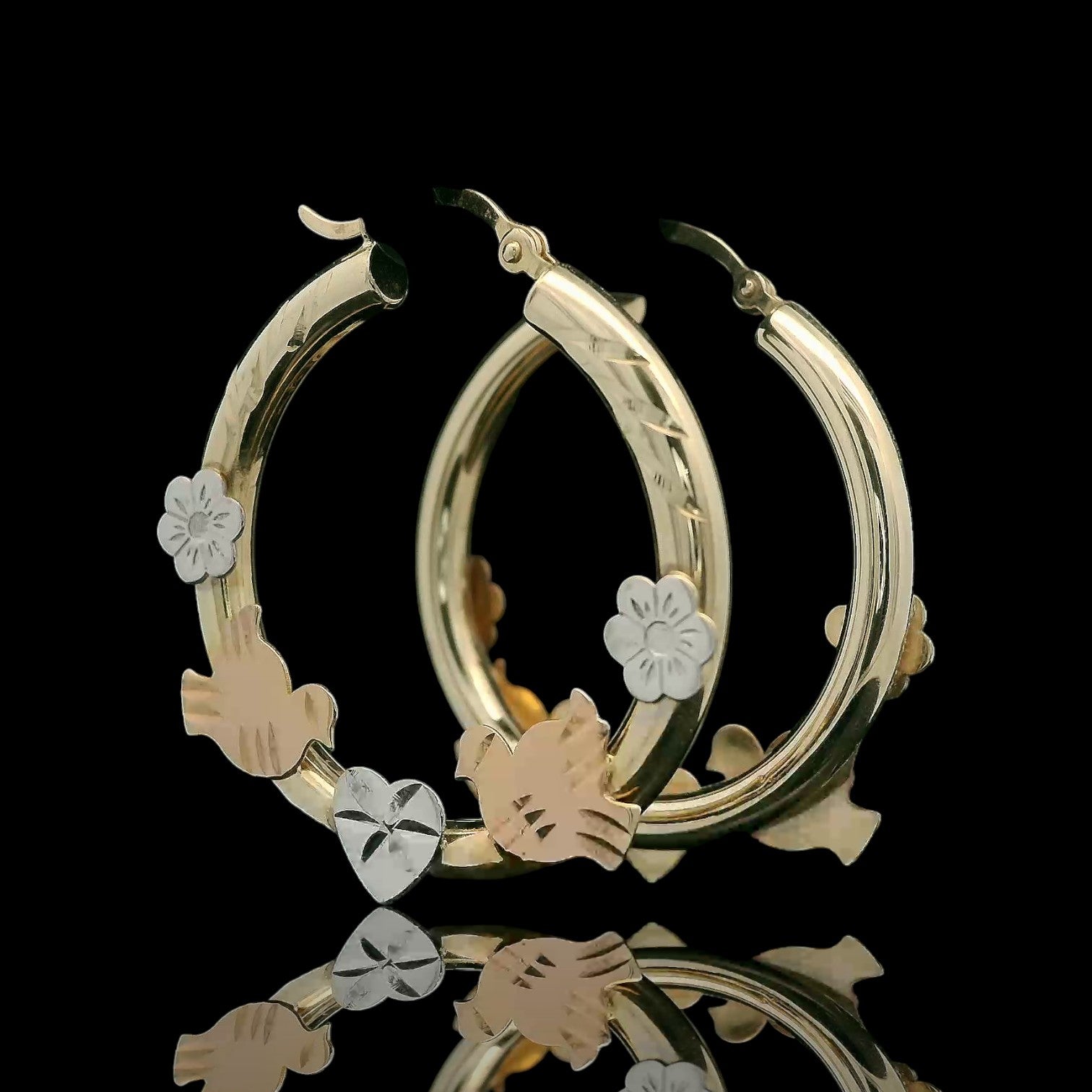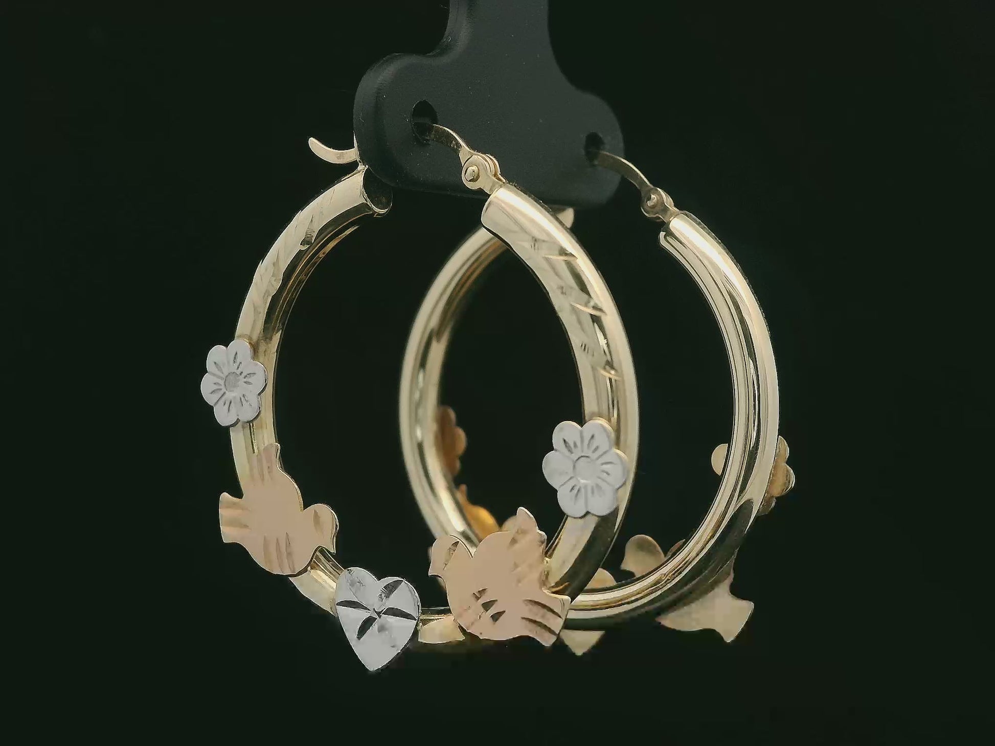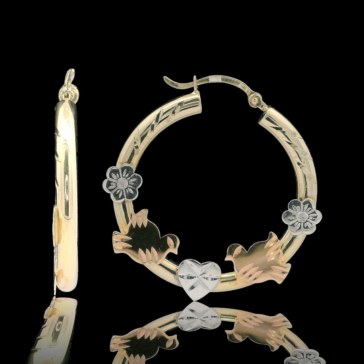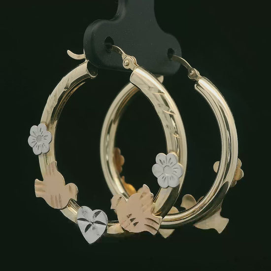 These charming 14K gold hoops are about 3mm thick and tell a little love story in every detail. The rounded yellow-gold hoops feature a subtle diamond-cut texture and are decorated at the front with rose-gold doves, white-gold flowers, and a white-gold heart in the center. Light on the ear but full of shine and movement, they’re a sweet, symbolic pair perfect for everyday wear or a special gift.