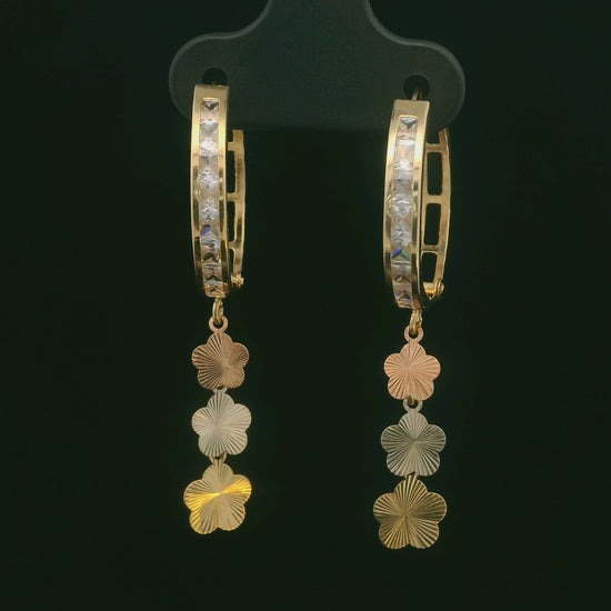 These 14K yellow gold hoops are 3mm thick and lined with sparkling cubic zirconia on the front for a bright, channel-set shine. From each hoop hangs a trio of textured flower charms that drop to about 35mm in total length, adding playful movement and shimmer. Lightweight but eye-catching, they’re perfect for dressing up your everyday look or adding a fun twist to a night-out outfit.