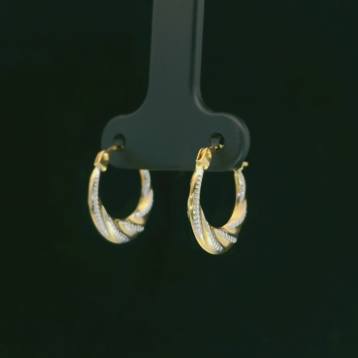 These 14K two-tone hoop earrings feature a sleek twisted design that blends yellow and white gold for a clean, modern shine. The 14mm size is perfect for everyday wear—noticeable but still easy to style with anything. Finished with a secure hinged snap closure for a comfortable, worry-free fit all day.