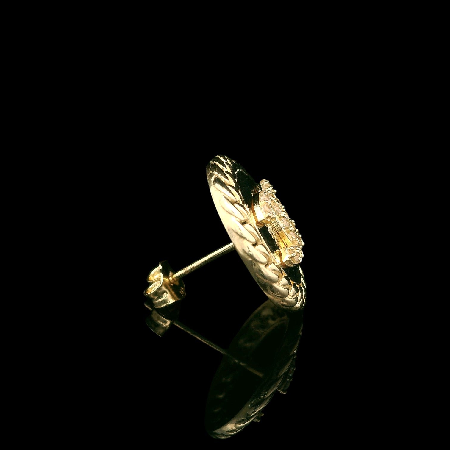 These 14K yellow gold stud earrings feature a rounded “button” front framed with a bold Cuban-style rope edge for a rich, textured look. At the center, a raised monogram-style double-C silhouette is set with clear CZ stones that add just the right amount of sparkle. Measuring about 15 mm across, they sit beautifully on the ear and fasten with classic friction backs—perfect for elevating everyday outfits or adding a luxury touch to a dressy look.
