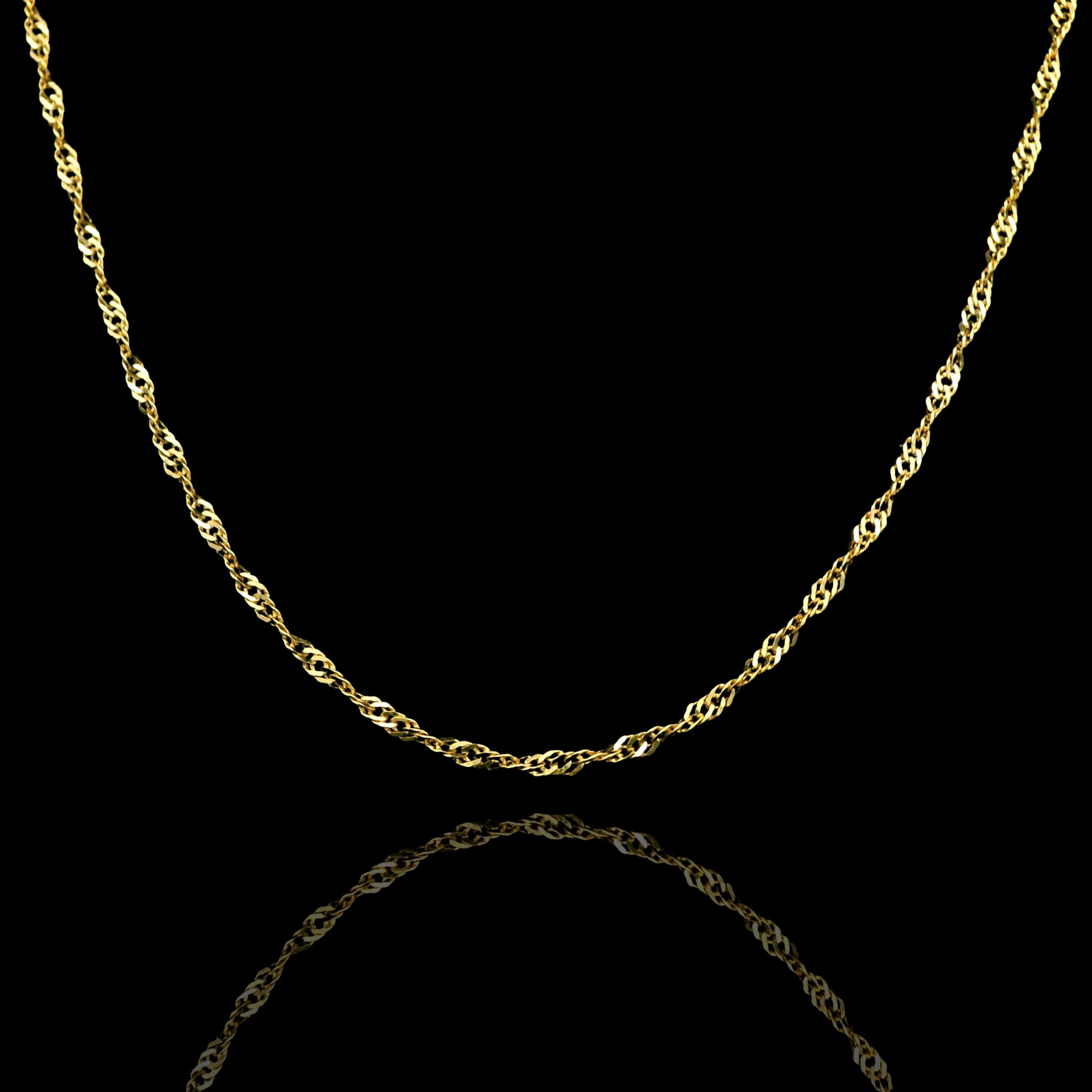 This 14K yellow gold Singapore chain features fine twisted links that create an elegant shine from every angle. Its light yet sturdy design is perfect to wear alone or paired with small to medium pendants. Finished with a secure lobster clasp for comfortable everyday use, it’s ideal for anyone looking for a delicate, bright, and classic gold chain.
