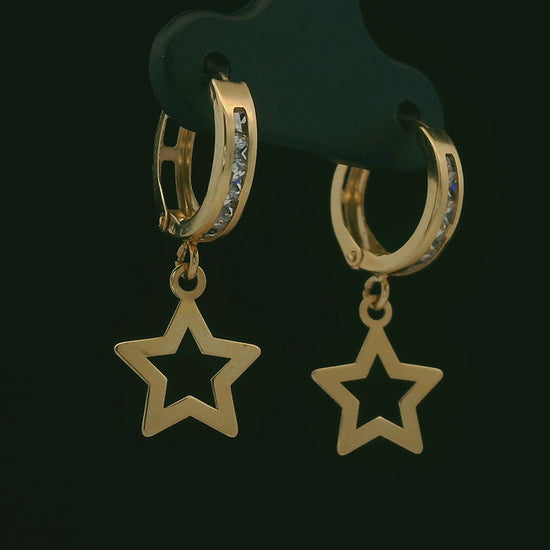 These playful 12mm huggie hoops are crafted in 14K yellow gold with a row of clear channel-set stones along the front and a dangling open star charm. The hoops hug the ear comfortably while the star adds fun movement and sparkle—perfect for everyday wear, a layered ear look, or gifting to someone who loves a little celestial touch.