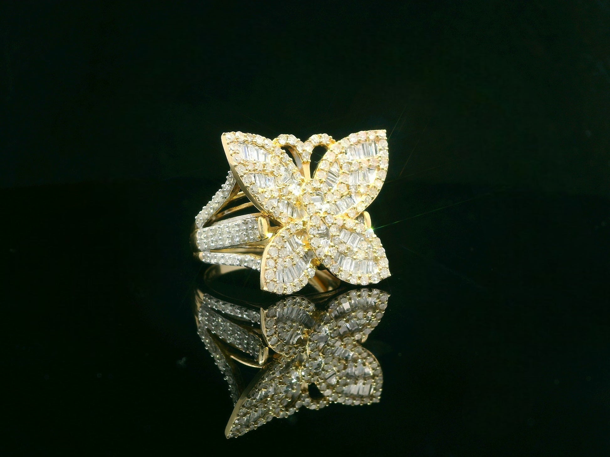 Exquisitely crafted to capture the essence of elegance. This Butterfly Diamond Cocktail Ring features a mesmerizing arrangement of baguette and round brilliant diamonds set in luminous yellow gold. The ring's distinctive design and shimmering diamond offer a captivating sparkle, making it a sophisticated statement piece for any occasion.
