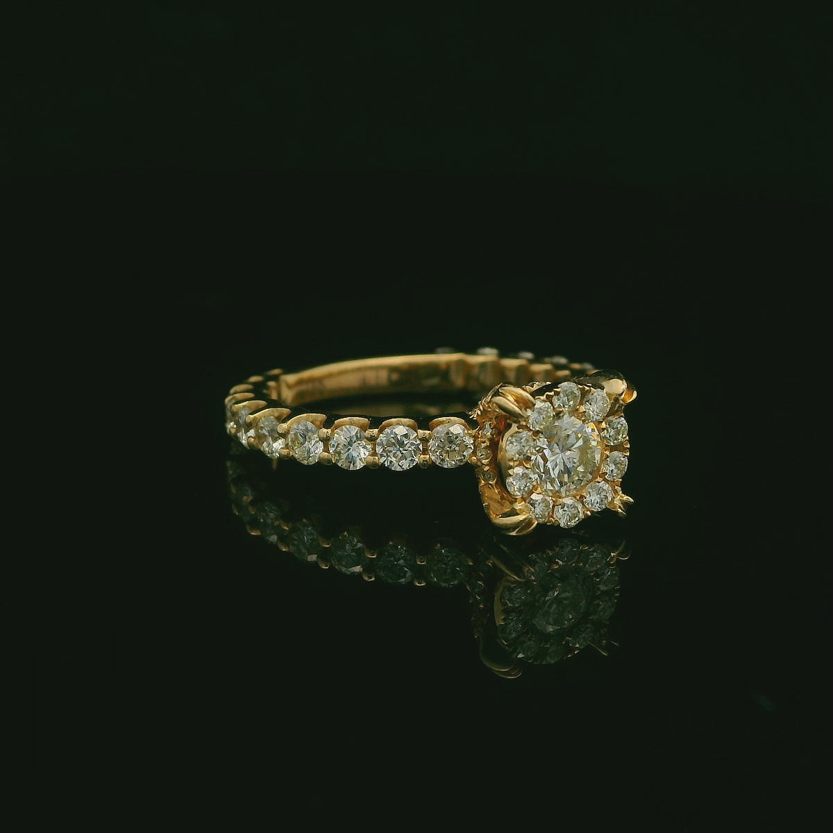 This ring is crafted in solid 14K yellow gold and set with approximately 2.25 total carats of round brilliant diamonds. The center features a sparkling cluster that gives the look of a larger round stone, while the shank is lined with diamonds all the way around for extra shine from every angle. A classic, timeless piece that works for everyday wear or special occasions and stacks beautifully with other bands.