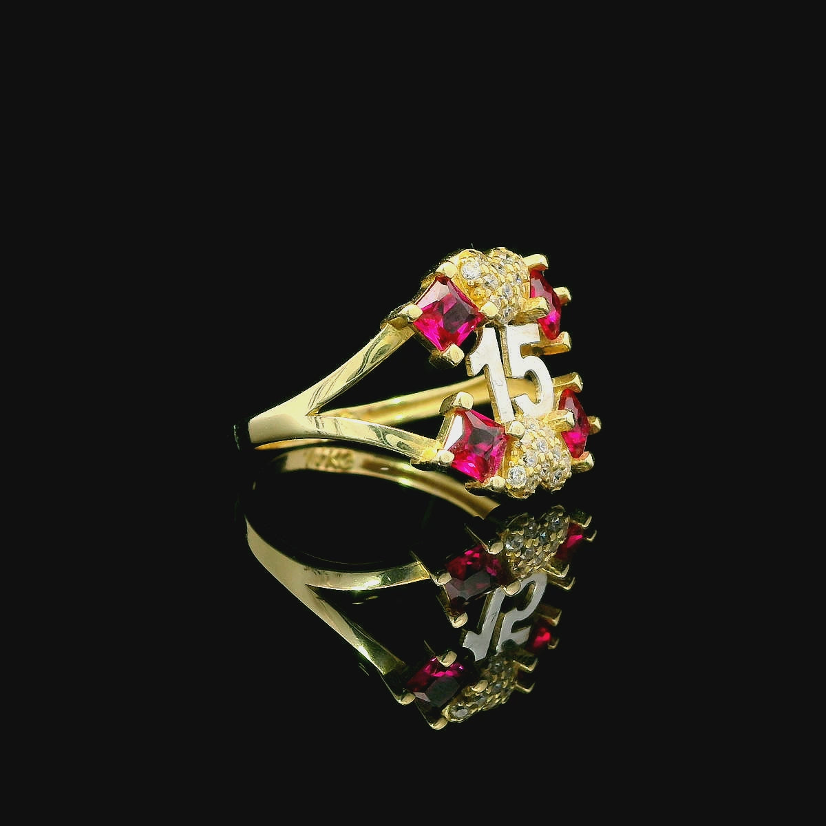 Celebrate her 15 Años with a ring that feels as special as the moment. This 14K gold quinceañera ring features a bold “15” centerpiece with ruby-red (CZ) stones and sparkly heart-shaped CZ details for extra shine. The face measures about 15mm, so it stands out beautifully in photos and in person—perfect for gifting, party looks, and memories that last.
