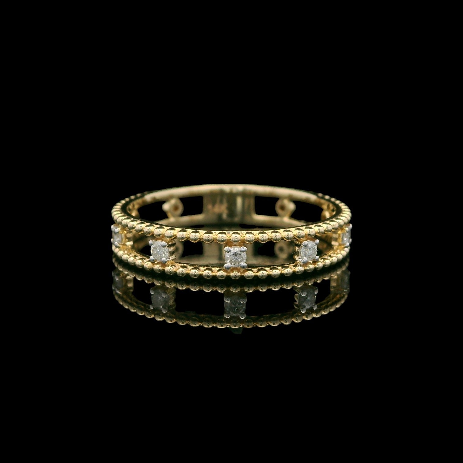 This dainty band is crafted in solid 14K yellow gold with a double row of tiny beaded edges and round diamonds spaced all around the center. The open, airy design keeps it light and comfortable, while the 0.11 total carat weight of diamonds adds a soft, everyday sparkle. Wear it solo for a minimalist look, stack it with other bands, or pair it with an engagement ring for a delicate, textured touch.