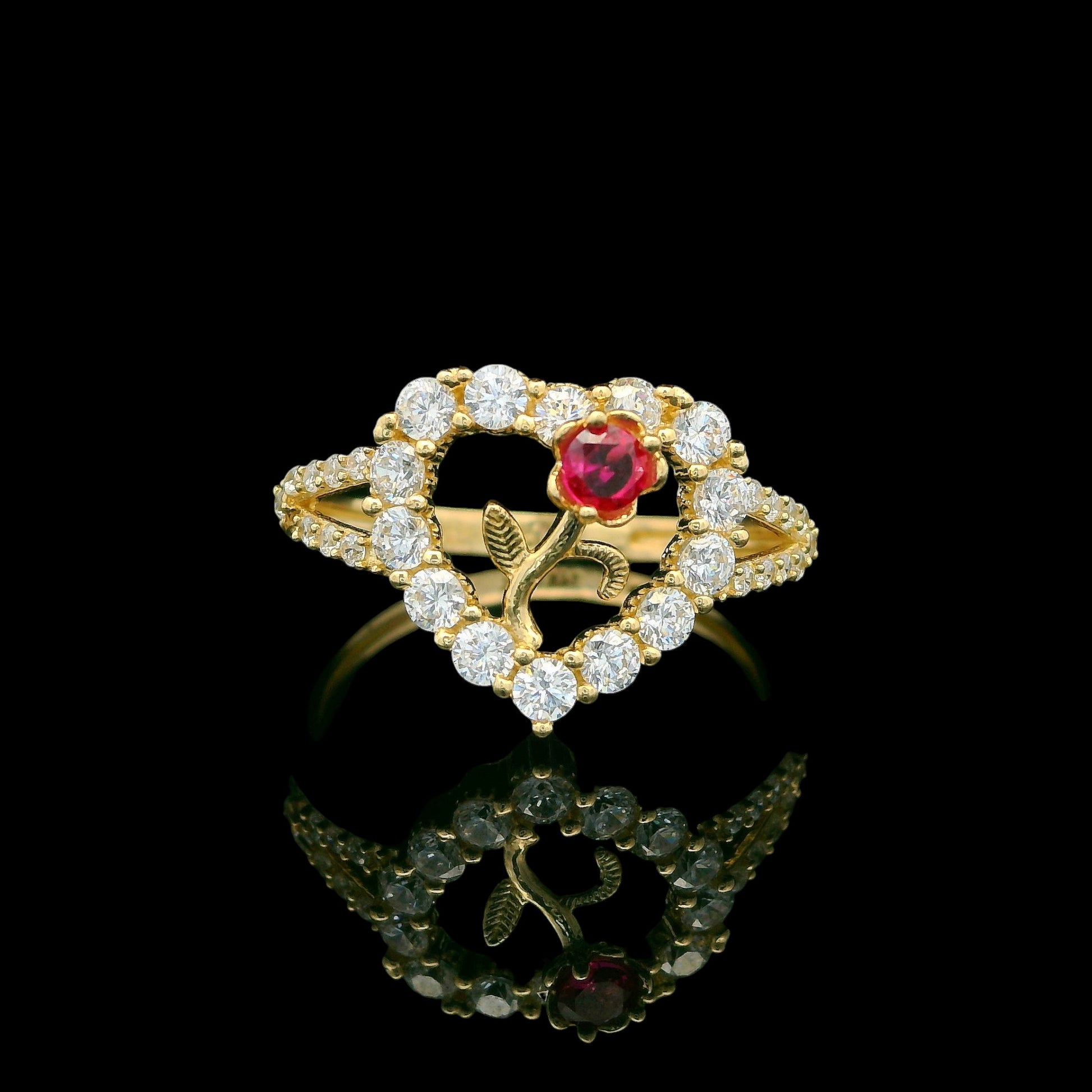 A romantic, eye-catching ring crafted in solid 14K gold. It features an open heart design outlined with sparkling CZ stones, plus a delicate rose detail with a ruby-red center for a unique pop of color. The split shank is accented with more CZ for extra shine from every angle. Top measures approximately 12mm.